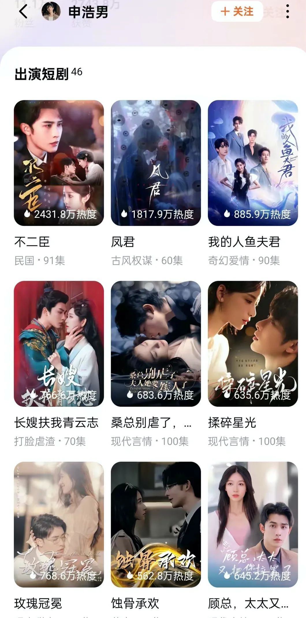 申浩男除了与王小亿和解了《凤君》,与王格格和解过《玫瑰冠冕》,与何健麒拍过双男主古装剧《与君长歌》除外,也主演了不少男频微短剧,比如民国题材的《不二臣》和古装题材的《长嫂扶我凌云志》。能看到申浩男的很多剧的制作都较为疏忽,不少剧集是微短剧发展早期拍摄的。