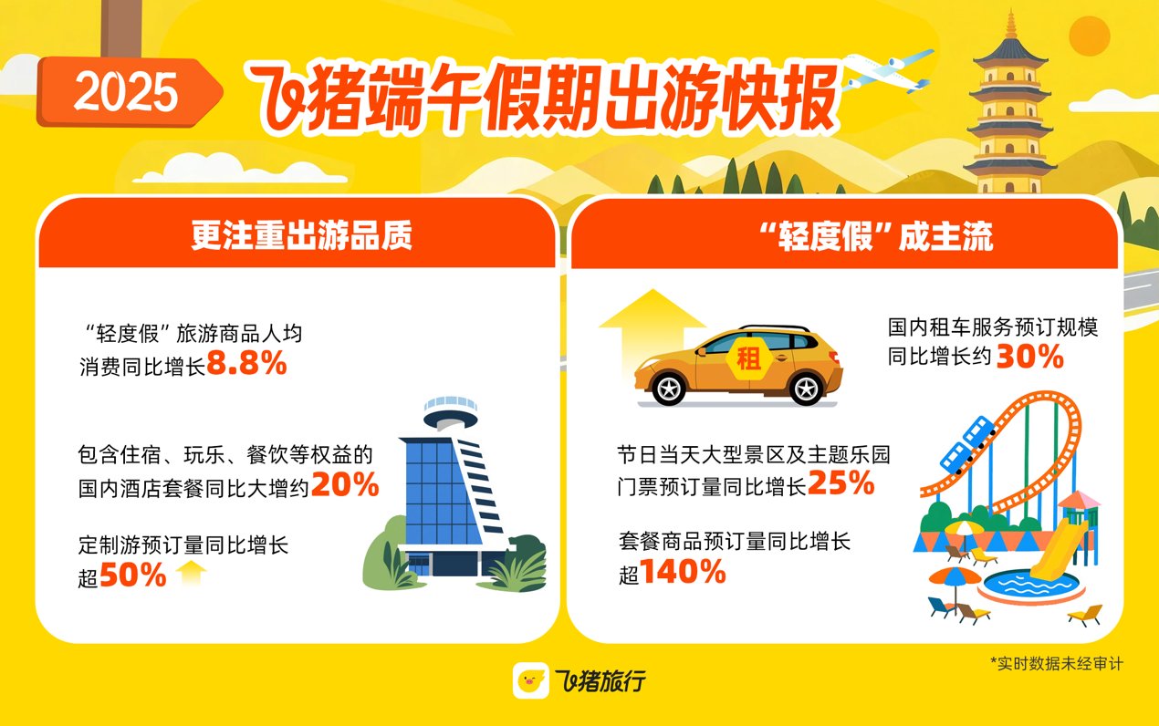 品性旅游需求不时上扬。飞猪数据透露,本年端午假期,包含住宿、玩乐、餐饮等职权的国内旅舍套餐同比大增约20%,定制游预订量同比增长超50%。