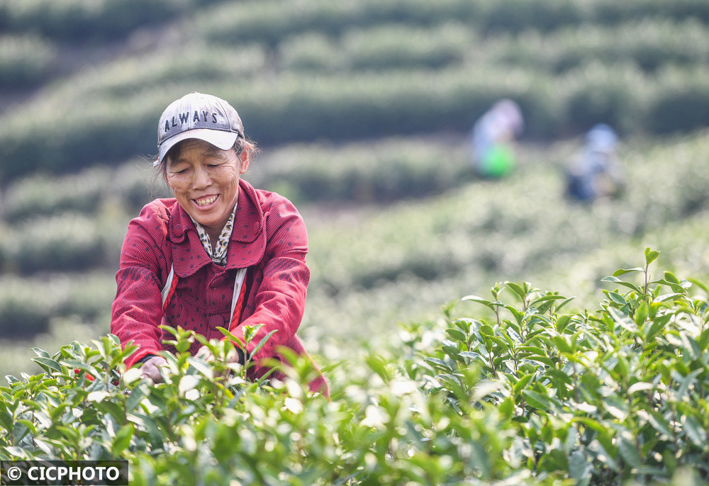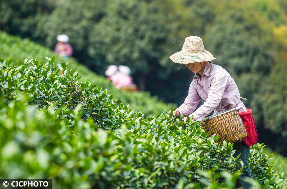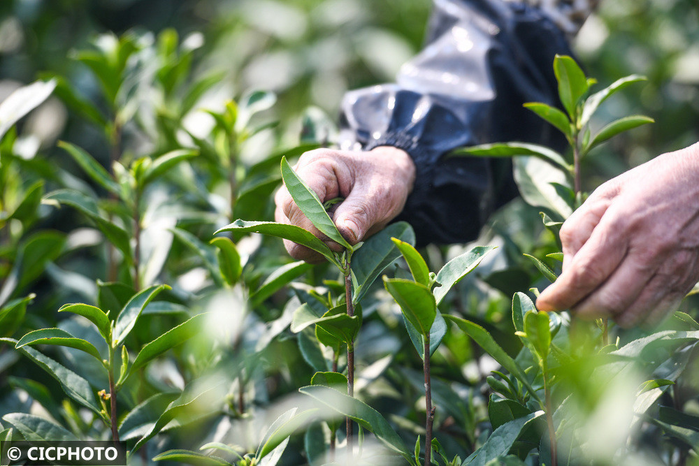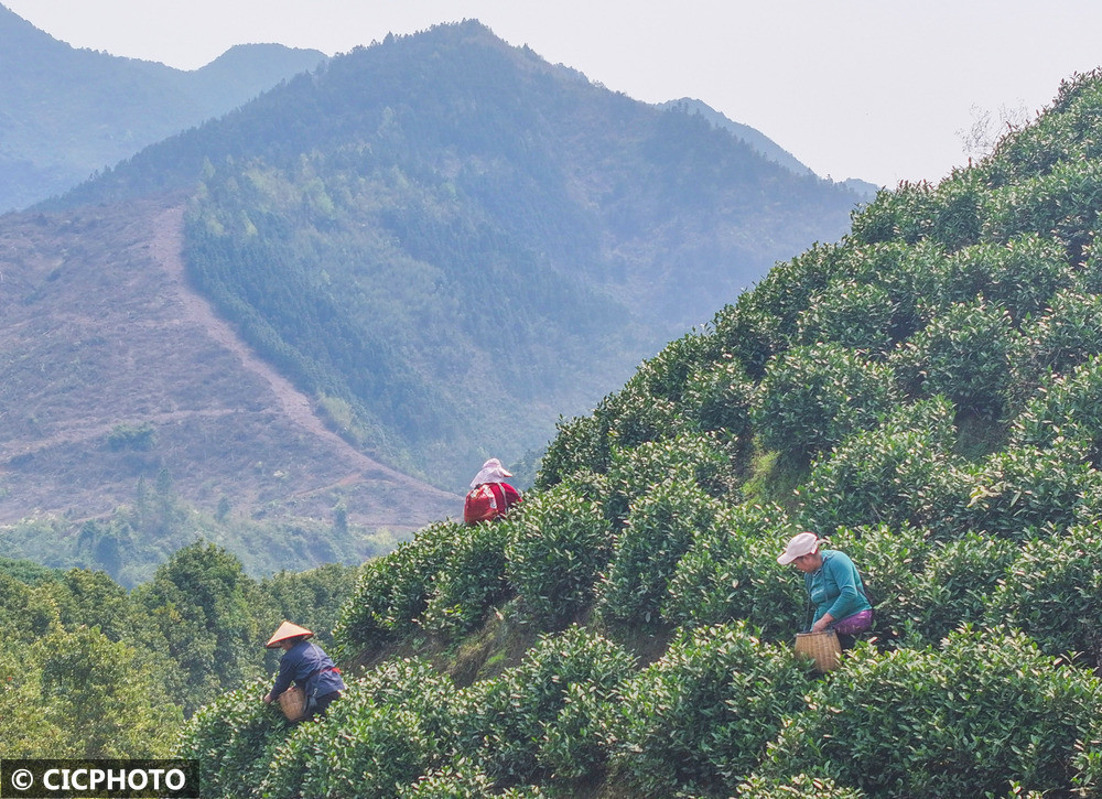 ↑2025年3月23日,在湖南省永州市江华瑶族自治县涔河汉镇会合村,茶农在茶园采茶。CICPHOTO/蒋克青 摄
