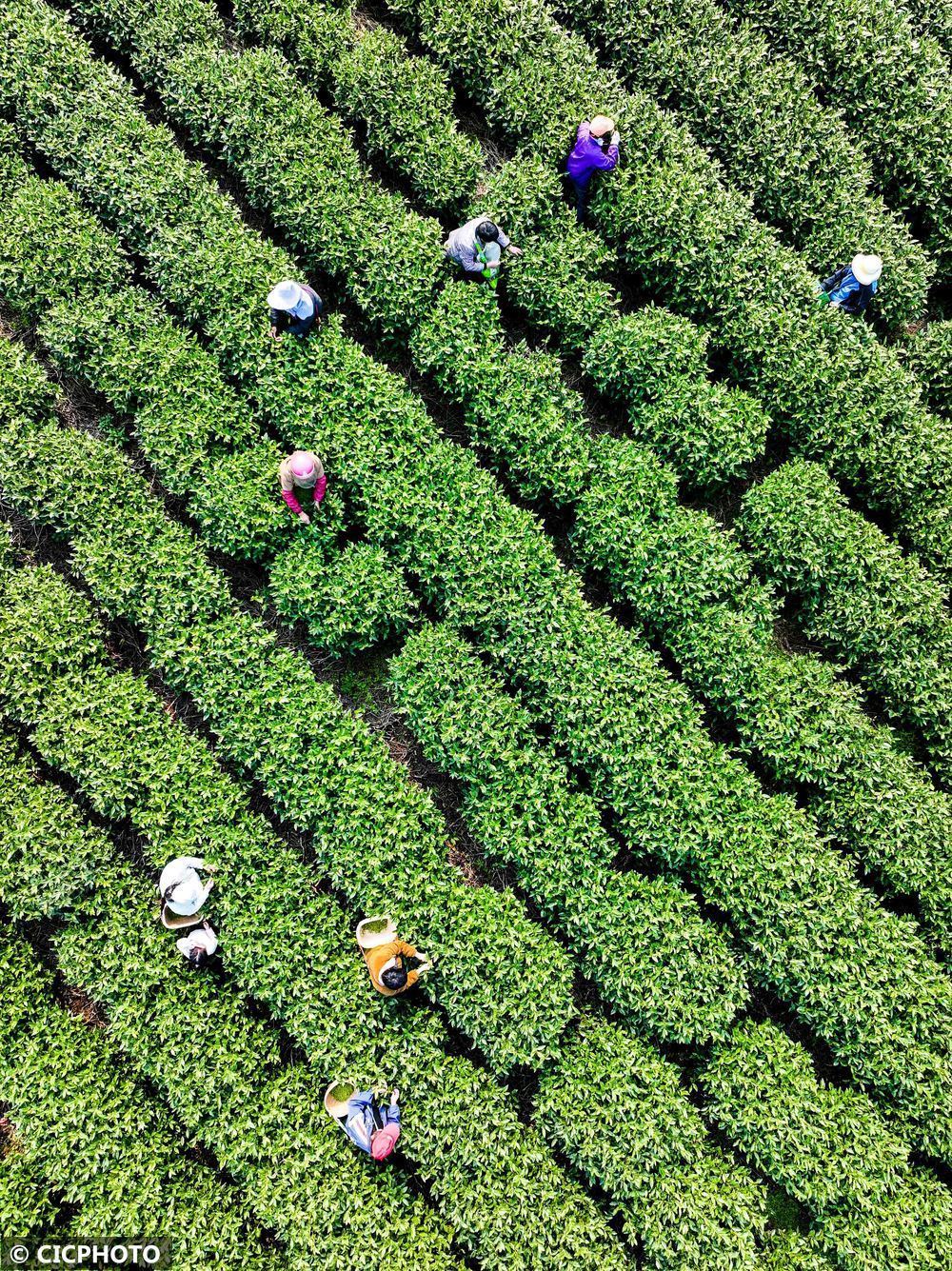 ↑2025年3月23日,在湖南省永州市江华瑶族自治县桥市乡大鱼塘村,茶农在茶园采茶。(无东说念主机相片)CICPHOTO/蒋克青 摄