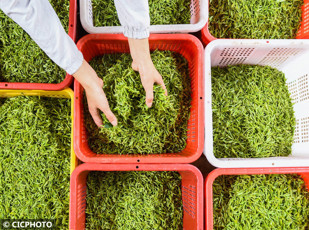 跟着气温回暖,湖南省永州市江华瑶族自治县各地茶园干预春茶采摘加工期,茶农抢握农时采摘春茶,一派劳苦局势。