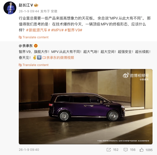1月9日,余承东在微博发文晓谕,鸿蒙智行首款旗舰MPV——智界V9将于春天认真亮相。赵长江随后转发该微博,并为智界V9预热,称“行业里总需要一些家具来拔高思象力的天花板”。有网友在批驳区缱绻赵长江若何评价智界V9这台车,他复兴说念:“保守忖度三年内莫得敌手。”此前电厂征引多方信源称,前比亚迪腾势品牌总司理、腾势方程豹直营管事部总司理赵长江已加入奇瑞汽车和华为勾通的品牌智界汽车,担任营销总司理一职。