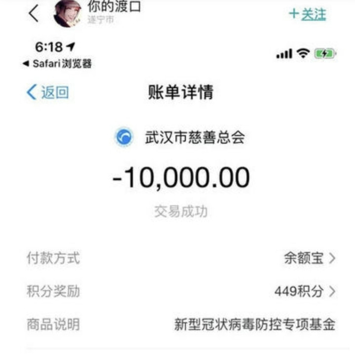 大三那年,新冠疫情爆发之时,口子姐二话没说,最初用在B站发视频挣得的钱,为武汉捐出了10000元,用以匡助扶持灾地。
