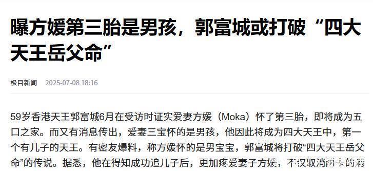 6月15日,郭富城庄重官宣太太方媛怀上三胎,跟着孕期鼓吹,外界对胎儿性别的料到越来越多,据媒体报说念,郭富城在暗里里“藏不住喜悦”,曾向一又友清晰我方行将“转运”。