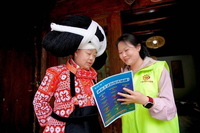 六盘水转移服务主说念主员在苗寨开展数智惠民服务。
