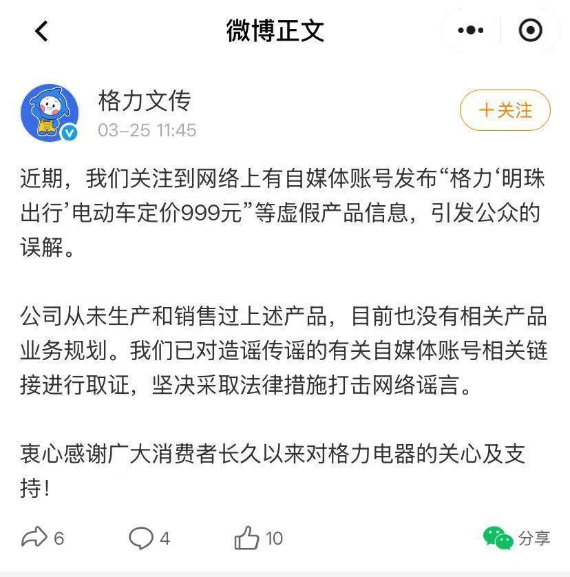3月25日午间,@格力文传发微博示意,近期,咱们端庄到集会上有自媒体账号发布“格力‘明珠出行’电动车订价999元”等失实产物信息,激发公众的误会。公司从未分娩和销售过上述产物开云(中国)kaiyun网页版登录入口开云体育,当今也莫得干系产物业务缱绻。咱们已对驳诘传谣的联系自媒体账号干系流通进行取证,坚毅取舍法律治安打击集会谣喙。